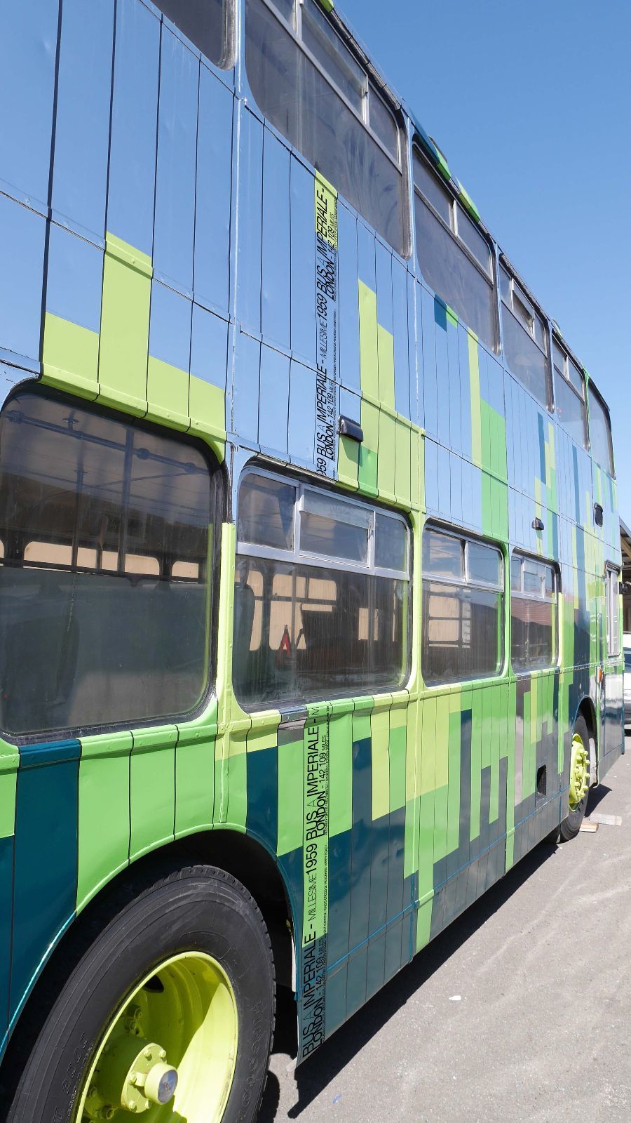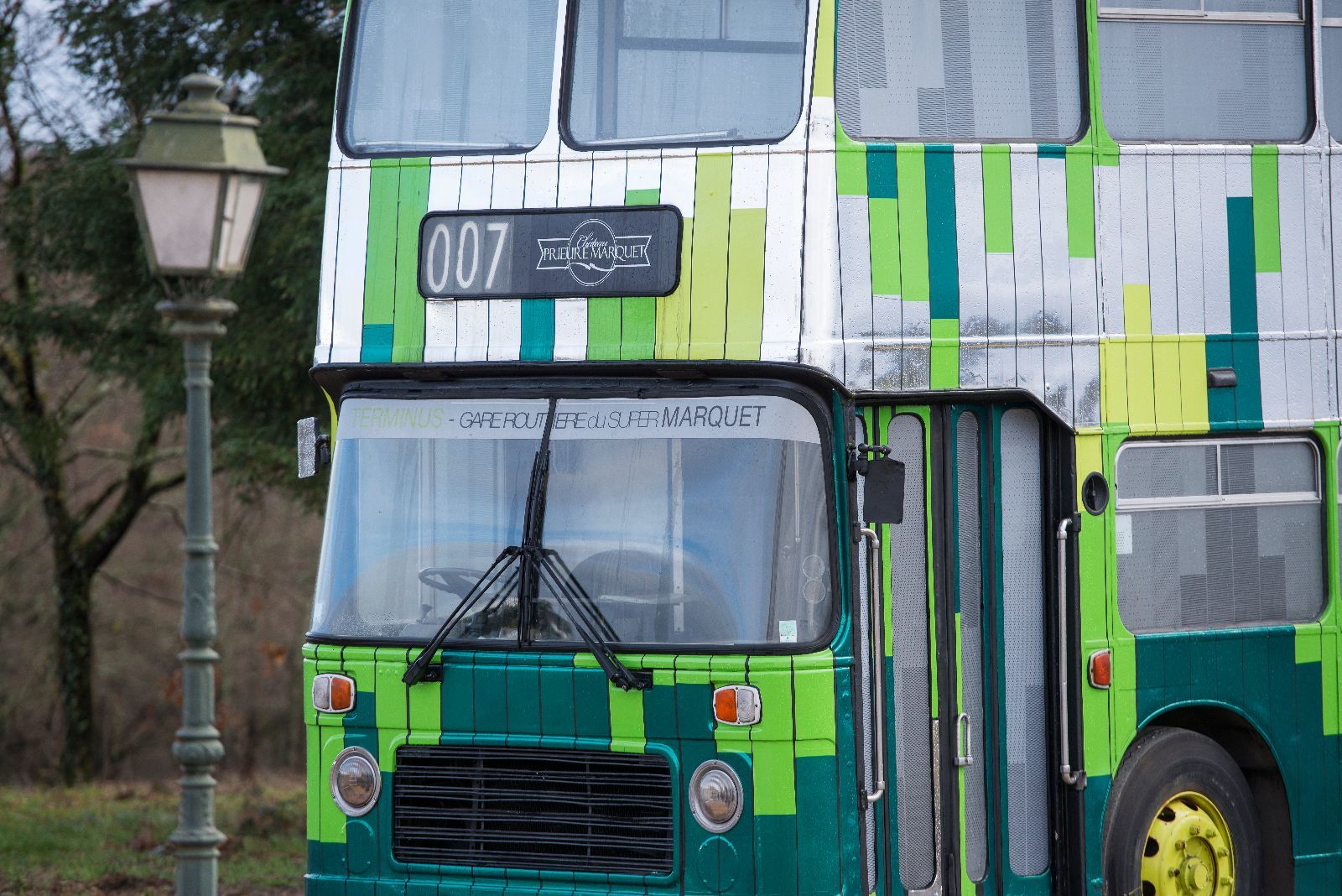 Le bus est installé au milieu du parc du château Prieuré Marquet et arbore des teintes vertes en partie basse (liaison sol/bus) et une teinte aluminium (reflets) en partie haute (liaison bus/ciel).