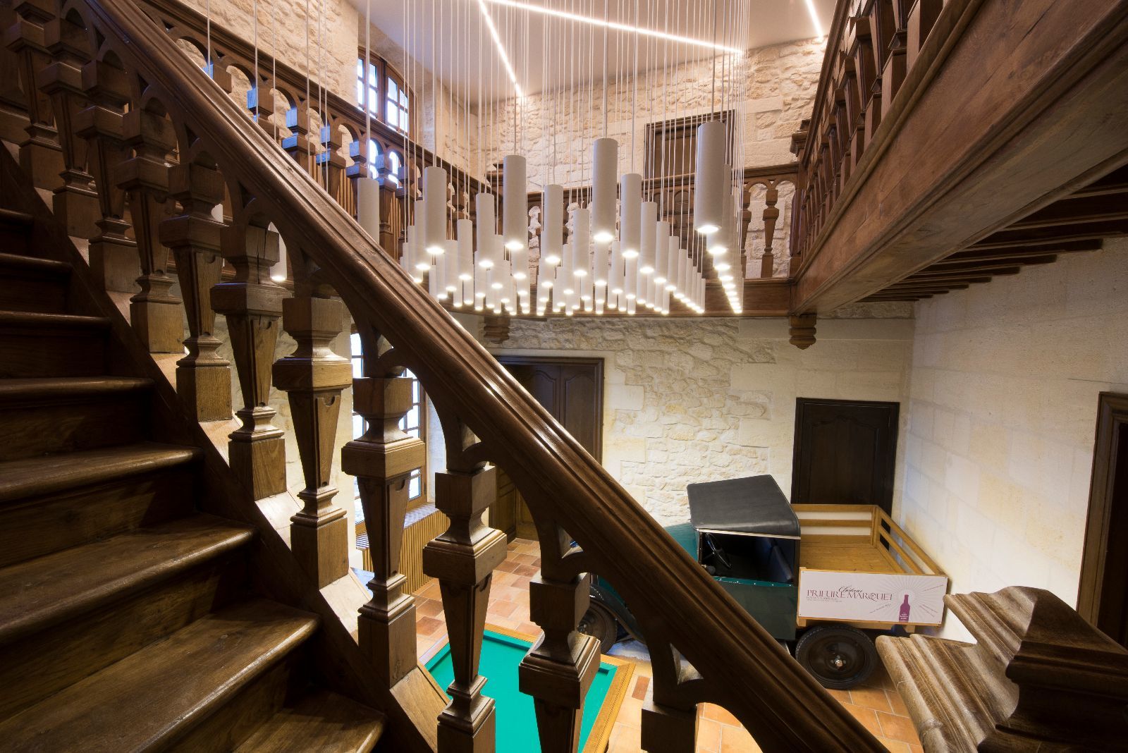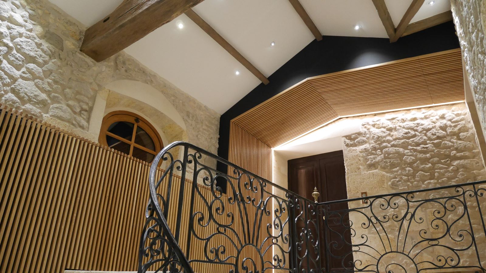 Le premier impact visuel est classique, ancien, mais une seconde lecture plus contemporaine apparait par transparence au travers des vitres, notamment par les éclairages en zigzag visibles en second jour dans le vestibule.