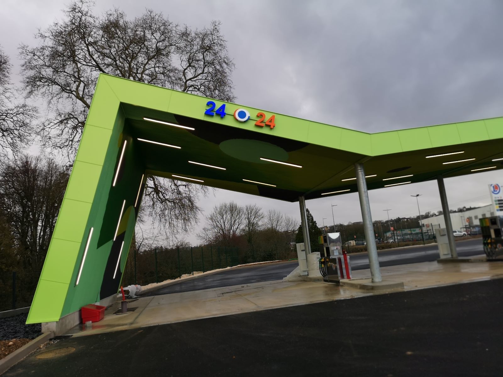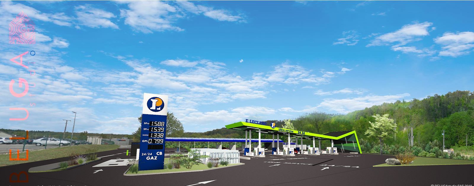 L'idée principale était de réaliser un auvent "simple" mais élancé, d'où l'utilisation de la ligne brisée partant du sol et s'arrétant en porte-à-faux.